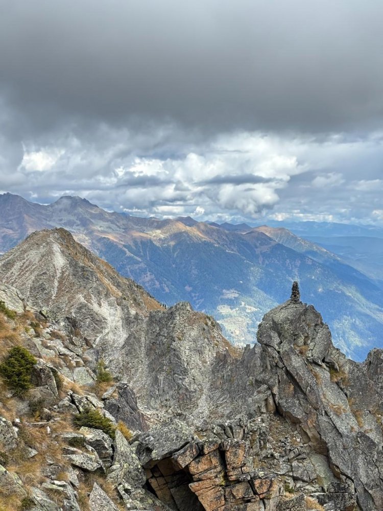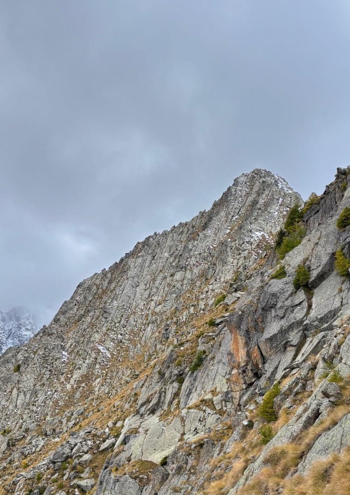 | Commento | Gita in ambiente maestoso solitario nei primi colori autunnali con spruzzata di neve sulle vette. Da Valpiana all’ormai paludoso Lago Venezia, si imbocca in direzione NNW il canalone erboso che porta al visibile Bochet de l’Omet (Passo di Montanel). Verso i 2350 m si obliqua progressivamente verso sinistra in direzione della cima, canali di misto roccette e zolle erbose gradinate dai camosci, costruiamo tanti ometti per un’antica abitudine, anche se abbiamo il GPS, molta attenzione per l’insidiosa erba olina che in traverso e discesa ci consiglierà di tenere i ramponi. In ultimo presenza maggiore di solida roccia, con tratti di piacevole uso delle mani (PD-). In vetta ad una prima cuspide, discesa per canalino nevoso lato nord e risalita ad un’altra punta di pochi metri più alta, dominata dalla scura piramide della Cima Pradazzo. In discesa ci teniamo alti sotto cresta con breve risalita al Bochet, passando sotto un risalto con grande ometto, forse da questo il nome (foto). Discesa verso il Lago Piccolo, neve tra i grossi massi, poi attraverso Lago di Barco e Malga Dosso rientro in Valpiana.