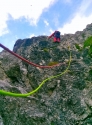Non sto a relazionare la via , perché ho usato quella dei Sass balòss che è molto precisa ,unica nota che devo segnalare se qualcuno dovesse ripeterla ,di portarsi il martello perché un chiodo della sosta n.4 sopra al masso incastrato,a noi è uscito ,l'abbiamo ribattuto con un sasso,nel caso poco prima del masso incastrato c'è un'altra sosta con due chiodi più sani (forse è quella della via tri e mes),all'uscita del quinto tiro dove la relazione dice di sostare su di un pino Mugo ora c'è una bella sosta con catena ed anello. Un saluto a Davide ed al suo socio che hanno fatto la via Tri e Mes F.1 la via di salita;F.2 la sosta sopra il masso incastrato;F.3 partenza del terzo tiro |
