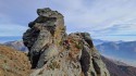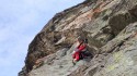 Via in ambiente grandioso e solitario, che si sviluppa su cinque contrafforti e alterna tratti sportivi a tratti dal carattere alpinistico. Utili friend da micro a 2 BD e vari rinvii allungabili. Avvicinamento: Da Condove, superare Mocchie e proseguire lungo la strada per Frassinere; subito dopo il ponte sul rio Puta svoltare a destra e prendere la ripida strada comunale Colle dell'Alpe per il Colombardo. Superare la borgata Prato del Rio e al bivio per il Sacrario Vaccherezza restare sulla strada principale che sale verso destra. Seguire la sterrata (in condizioni discrete, al momento percorribile anche con un'auto bassa) sino alla curva dell'Alpe Gighé (m. 1670 s.l.m., cartello indicatore), dove si lascia l'auto. (dal 15 ottobre a tarda primavera, sterrata chiusa da sbarra, calcolare circa 15 minuti in più di avvicinamento). Attraversare il torrente e salire la breve rampa che porta all'alpeggio. Superarlo, risalire il costone di alcuni metri, quindi seguire verso destra una traccia che transita sotto un casolare e continua a mezza costa per qualche centinaio di metri. Superare le cuspidi di due torrioni ben visibili sul margine destro del sentiero e dopo un ulteriore breve tratto in leggera salita affacciarsi nella bellissima conca delle Scalancie, caratterizzata da un susseguirsi di torrioni inframmezzati a terreni prativi, canali erbosi e pietraie. Seguire la traccia che attraversa la conca da ovest a est in lieve discesa, fino a raggiungere la base del primo torrione, da cui attacca la via (circa 20 minuti dall'auto; numerosi bolli rossi e qualche ometto lungo il percorso, 35/40 minuti se la sbarra è chiusa). Descrizione L1: salire il magnifico muro tecnico a microtacche fino a sostare subito dopo un tettino (15 m, 6a+). L2: salire in senso ascendente verso destra la splendida placca lavorata, quindi risalire il muro verticale fessurato, superare un breve risalto e sostare all’apice del torrione (35 m, 6a+).Superare la selletta e scendere per una ventina di metri fino alla base di una breve placca (bolli rossi, cordino su clessidra alla base). L3: risalire la bellissima placca lavorata, ribaltarsi su cengia erbosa e sostare contro il risalto prospiciente (20 m, 5a). Risalire verso sinistra per quasi sessanta metri il ripido prato (bolli rossi), fino a raggiungere la base del torrione sovrastante e reperire l’attacco all’altezza di una placca nerastra. L4: salire il difficile muro solcato da fessure orizzontali, superare una breve rampa abbattuta e sostare alla base di uno strapiombo (20 m, 6b). L5: traversare leggermente verso sinistra e vincere lo strapiombino con difficile passo di ristabilimento, quindi proseguire su bella placca lavorata, superare un tettino e una stretta cengia erbosa e sostare (25 m, 6a+). L6: salire la bella placca fessurata, quindi superare un delicato ribaltamento e un breve muretto, attraversare la stretta cengia e sostare (25 m, 6a). L7: alzarsi con passo sbilanciante sulla rampa, quindi superare bei risalti di roccia molto lavorata, traversare verso destra tenendosi bassi sulla placca abbattuta e sostare (20 m, 5c). L8: proseguire verso destra e attaccare la bellissima placca fessurata fino a sosta in una nicchia (20 m, 5b).Scendere il canalino erboso per una ventina di metri fino al punto più basso del torrione (bolli rossi). L9: risalire una serie di risalti di roccia molto lavorata, quindi traversare verso destra su tratto più facile con chiodatura distanziata, fino a sosta (30 m, 5c). L10: alzarsi su facili risalti sprotetti, aggirare uno spigolo e salire la breve placca finale fino alla cresta (20 m, 5b; far saltare la corda prima della placca per evitare attriti).Seguire la crestina rocciosa per una decina di metri (spit), poi scendere nel canale erboso per una ventina di metri, fino a reperire l’attacco della via, alla base di un sistema di diedri (freccia e bolli rossi). L11: alzarsi su un pilastrino e attaccare il primo diedro dopo difficile passo di ristabilimento; al termine del diedro traversare brevemente a sinistra, ribaltarsi su placca delicata e salire il successivo impegnativo diedro leggermente strapiombante, fino a uscirne sulla destra con passo delicato e raggiungere la sosta aerea (15 m, 6b continuo, tiro chiave della via). L12: seguire l’esposto traverso verso destra restando bassi, quindi salire una serie di risalti verticali con passo molto delicato in placca, alzarsi su facile rampa lichenata e sostare alla base di una nicchia (25 m, 5c, un passo 6a+). L13: portarsi sotto il punto debole dello strapiombo e superarlo con passo atletico, alzandosi su uno spuntone di roccia; seguire brevemente la bellissima lama e proseguire verso destra su due magnifici muri verticali lavorati a fessure orizzontali, fino a sosta (40 m, 6a+). L14: superare dei facili risalti, poi salire un bel muro lavorato, uscirne proseguendo sul filo abbattuto della cresta, superare un primo risalto a grosse prese, quindi un secondo risalto con passo difficile di ristabilimento su placca, fino a sosta (40 m, 5c, un passo 6a) L15: passare sotto il filo di cresta in costante esposizione, fino a sosta finale su spit singolo (30 m, II, bollo rosso alla sosta). Per la discesa, il modo più veloce (in assenza di nebbia) è risalire il pendio prospiciente seguendo i bolli rossi fino ad arrivare all’altopiano; da lì seguire le cuspidi di uscita dei vari torrioni e scendere nel canale erboso che delimita l’ultima cuspide, fino a intercettare un sentiero ben tracciato che porta direttamente all’alpeggio Gighé. (che già si vede dall'ultima cuspide) Storico Via aperta dal basso da Mauro Pettigiani e Antonio Migheli fra giugno e luglio 2025. Relazione sopra fatta da loro. GIUDIZIO PERSONALE: Arrampicata che si svolge in un contesto veramente molto bello. Avvicinamento e discesa ben segnati ,comodi e veloci Roccia nei primi tiri bellissima, poi rimane sempre bella ma con tratti un poco sporchi e con lichene, ma si sale bene. (visto l’ambiente , la ti