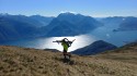 Dopo la grande soddisfazione di aver raggiunto facilmente i 3300mt del Monte Sobretta a Santa Caterina Valfurva, la neve ci ha costretto a scendere di oltre 1000 metri, perciò per non perdere le motivazioni che ti danno le Alte Quote, dovevamo scegliere qualcosa di egualmente emozionante e possibilmente libero quasi totalmente da neve. Così pensiamo al Bregagno, rinunciamo a partire dal fondovalle come qualche anno fa e partiamo poco sotto Gallio a 980mt. Salita discretamente agevole come pendenza, un po' disconesso il fondo, ai circa 1300mt si alza in volo l'Aquila a cui dedico un bel pezzetto verso inizio video che poi nella picchiata viene raggiunta da una seconda; pedaliamo fino ai circa 1650mt sopra Samamate, poi il pezzo più faticoso a spinta o spalla fino ai 1905mt del Bregagnino dove perdiamo altri 50mt di dislivello per poi risalire sulla dorsale finale che però ci risulta meno impegnativa del Bregagnino. Sempre stupendo panorama a 360 gradi dagli Appennini alla Dorsale Alpina e Alto Lago di Como fino allo Scalino. Per la discesa inzialmente pensiamo di fare l'anello scendendo sul Dosso di Naro per rientrare dal Rifugio Cauna, ma le neve ed il fondo umido non è ideale per un itinerario tecnico ed esposto e per fortuna perchè proprio in quella direzione una nube nera si addossa alla montagna, mentre noi ripuntando a Sud la sfuggiamo sempre di qualche centinaio di metri e ci godiamo delle vedute fantastichem in alcuni tratti riesci a vedere contemporaneamente lago di Como e di Lugano con Porlezza Menaggio Bellagio e Varenna e comunque facciamo delle varianti parziali al più facile itinerario di salita. TENDENZA: ottima fino a prossime nevicate sotto i 2000mt. PERIODO MIGLIORE: per il contrasto verde e blu del lago direi maggio o al limite settembre, in Estate, salvo vento da Nord è facile trovare foschia o cumuli che impediscono la magnifica vista a sbalzo sul Lago FOTO 1 Salita Bregagnino ed il Centro Lago 2 Parte Alta 3 Mappa Wikilock |
